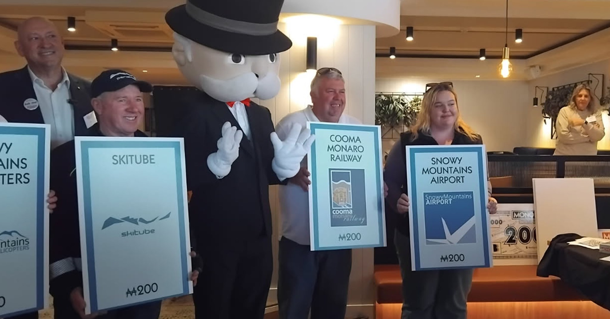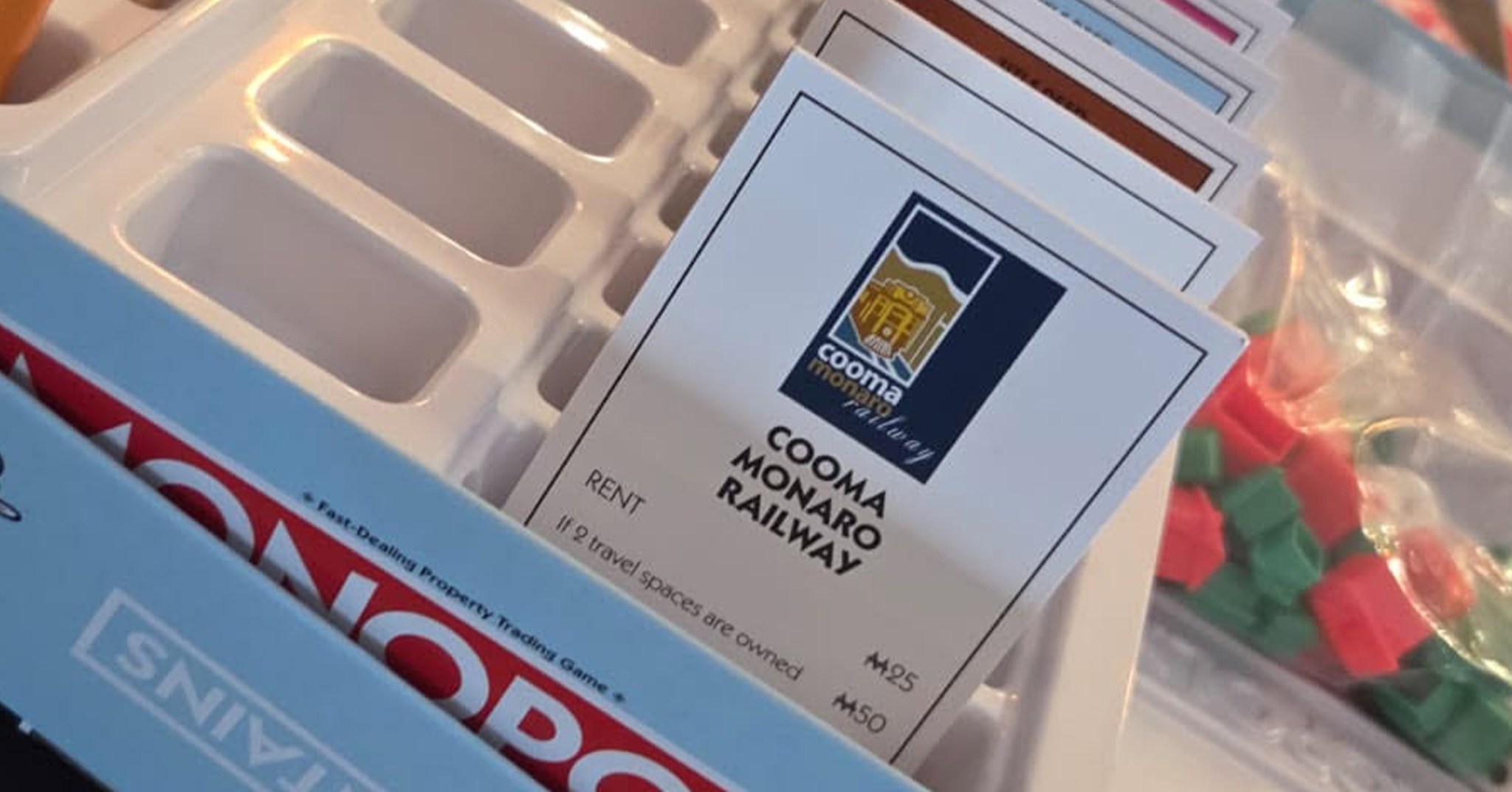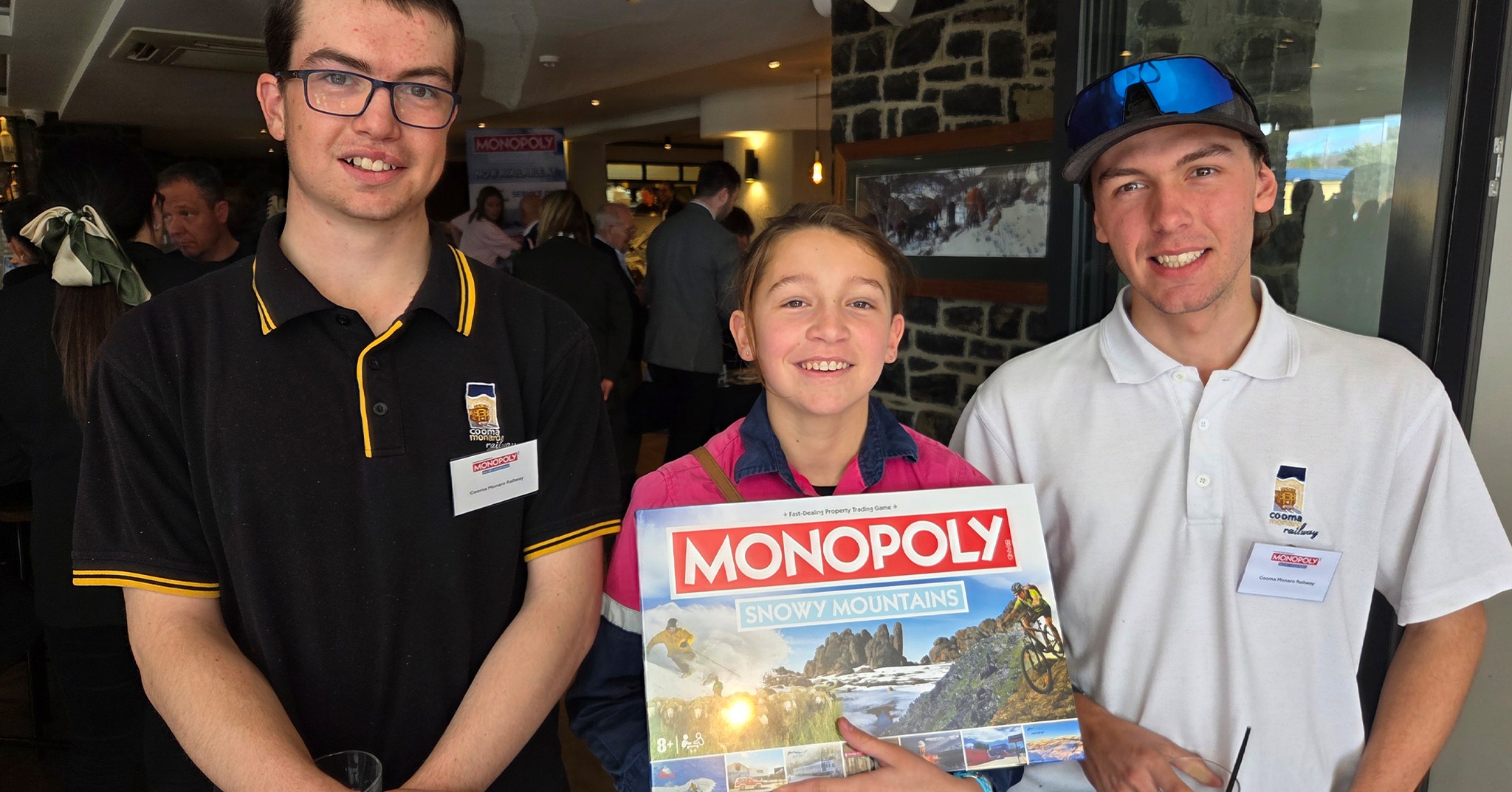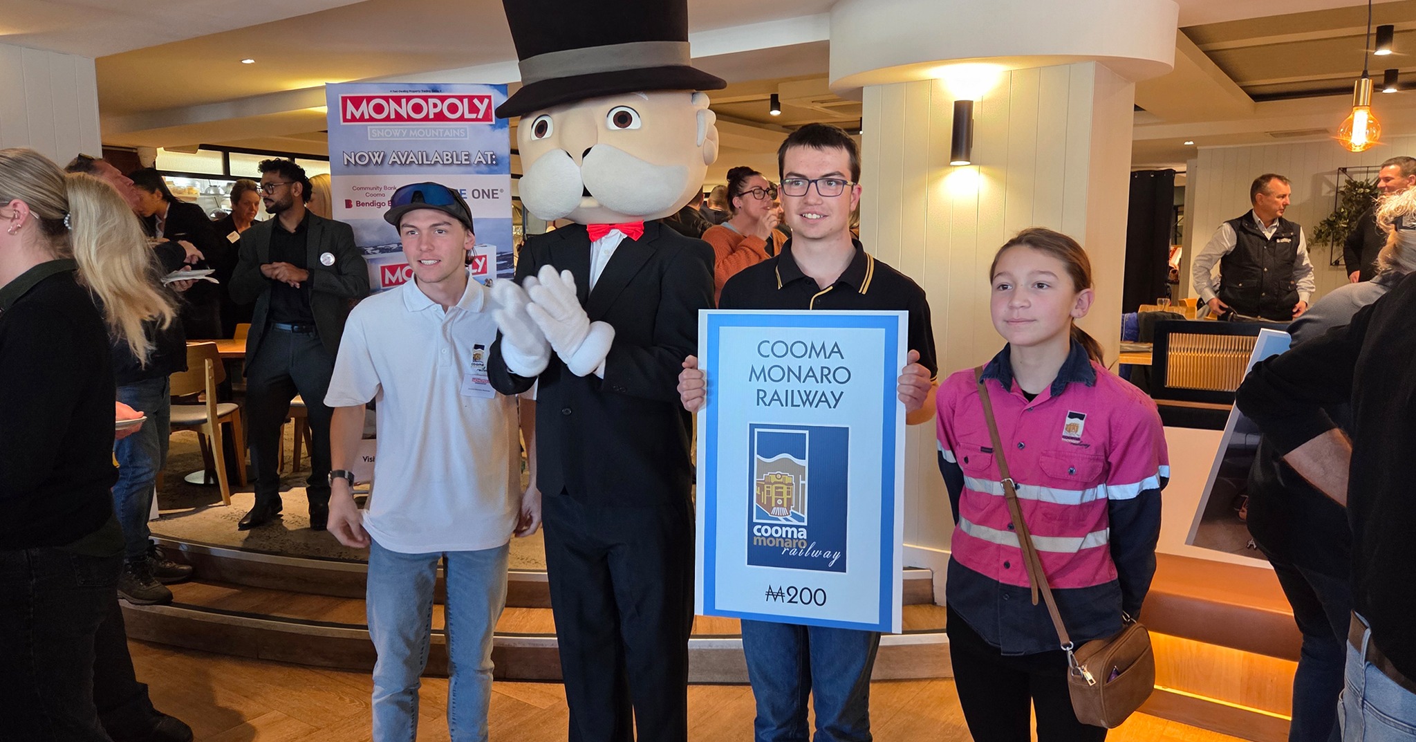 Cooma Monaro Railway is really excited to be part of the Monopoly Snowy Mountains Edition game that was launched last Friday in Jindabyne and be presented with our property tile. Not only do we have our own transport square, we also have a chance card in the game.